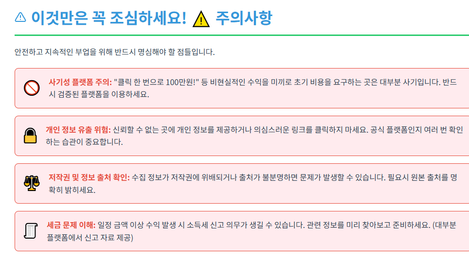어떤 부업이든 조심해야 할 부분은 있기 마련이죠. 이 검색 부업에서도 몇 가지 주의사항이 있습니다. 첫째, 과도한 수익을 미끼로 하는 사기성 플랫폼을 조심하세요. “”클릭 한 번으로 100만원 벌기!””와 같이 비현실적인 수익을 제시하며 초기 비용을 요구하는 곳은 대부분 사기일 가능성이 높습니다. 반드시 검증된 플랫폼을 이용하는 것이 중요해요. 둘째, 개인 정보 유출에 주의해야 합니다. 신뢰할 수 없는 곳에 개인 정보를 제공하거나, 의심스러운 링크를 클릭하지 않도록 항상 조심하세요. 공식 플랫폼인지 여러 번 확인하는 습관을 들이는 것이 좋습니다. 셋째, 저작권 및 정보 출처 확인에 신중해야 합니다. 수집하는 정보가 저작권에 위배되거나, 출처가 불분명한 경우 문제가 발생할 수 있으니 항상 유의해야 합니다. 필요한 경우 원본 출처를 명확히 밝히는 것이 중요해요. 마지막으로, 세금 문제에 대한 이해가 필요합니다. 일정 금액 이상의 수익이 발생하면 소득세 신고의 의무가 생길 수 있으니, 미리 관련 정보를 찾아보고 준비하는 것이 좋습니다. 대부분의 플랫폼에서는 소득 신고에 필요한 자료를 제공해주니 걱정하지 마세요.