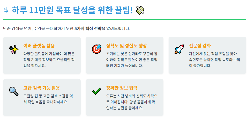 | 4단계: 수익 정산 | 작업 완료 후 검수를 거쳐 수익이 지급됩니다. | 건당 지급, 정확도에 따라 추가 보너스 가능 |