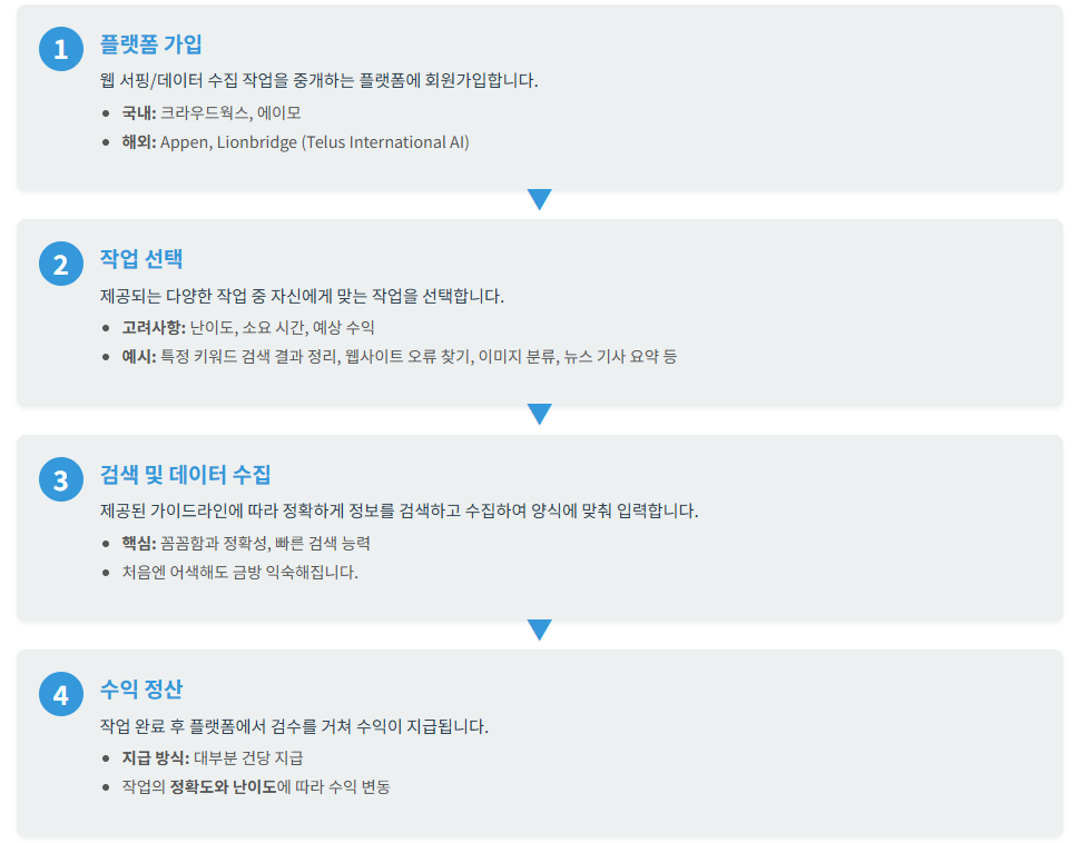 | 1단계: 플랫폼 가입 | 웹 서핑/데이터 수집 부업을 중개하는 플랫폼에 회원가입합니다. | 크라우드웍스, Appen 등 국내외 플랫폼 활용 |
