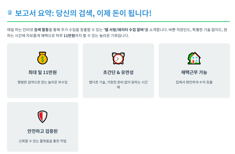 여러분, 혹시 이런 적 있으시죠? “”월급만으로는 생활이 팍팍해, 뭔가 추가 수입이 절실해!”” “”바쁜 직장 생활 속에서 부담 없이 할 수 있는 부업은 없을까?”” 매일 수많은 정보를 검색하고, 온라인 쇼핑을 즐기는 당신이라면, 지금부터 이 글에 주목해주세요! 여러분의 평범한 검색 활동이 놀라운 부수입으로 이어질 수 있답니다.